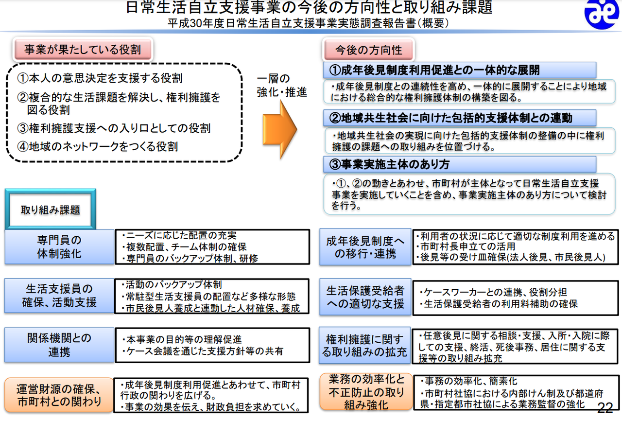 以上から、日常生活自立支援事業は成年後見人制度を補完するような形で社会のニーズに応えようとしたものと考えられる。
