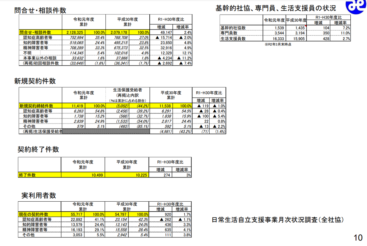 即ち独居高齢者が約700万人や認知症高齢者約700万人と急増する中で需要の変化に量、質共に追いつけず、相談件数が増加するにもかかわらず、捕捉し切れていないことが伺える。 成年後見人制度も不十分な制度であり、それを埋めるべき日常生活支援事業も保管機能を十分に発揮できていないのではないかと推察される。