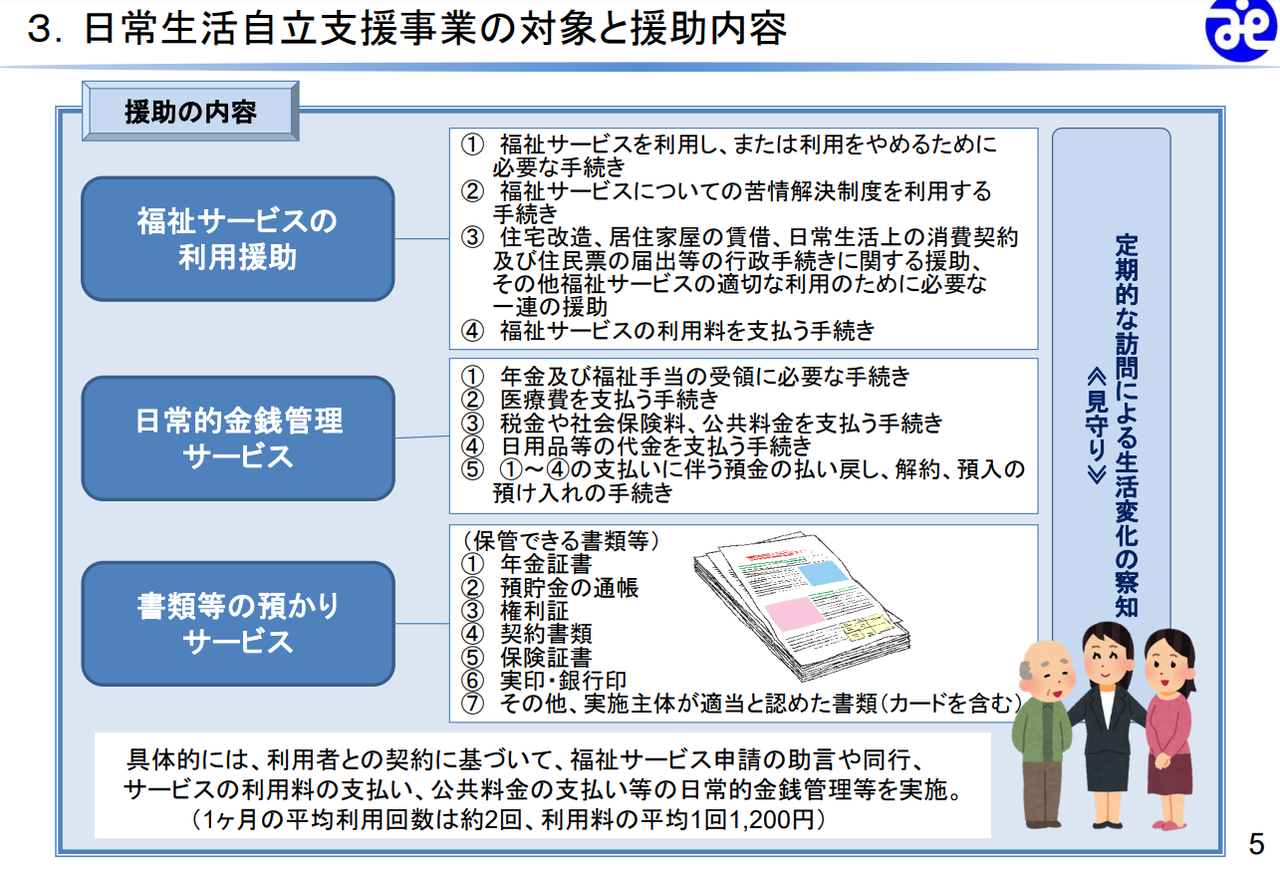 毎日の暮らしの中で、不安や疑問、判断に迷ってしまうことが生じた場合に、福祉サービスの利用手続きや、金銭管理の手伝いをして、認知症高齢者等で判断能力が不十分な方が安心して暮らせるようにサポートする事業が日常生活自立支援事業である。