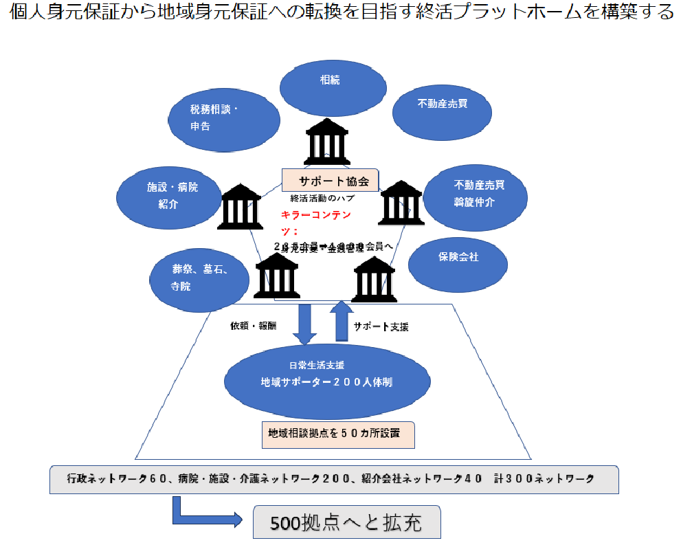 身元引受事業を中心に、医療、介護、行政の皆様との連携を強化すると同時に、弁護士等士業の皆様、不動産事業者、葬祭事業者等広範囲に連携をしながら、地域保証のプラットホーム作りに全力を注ぎます。