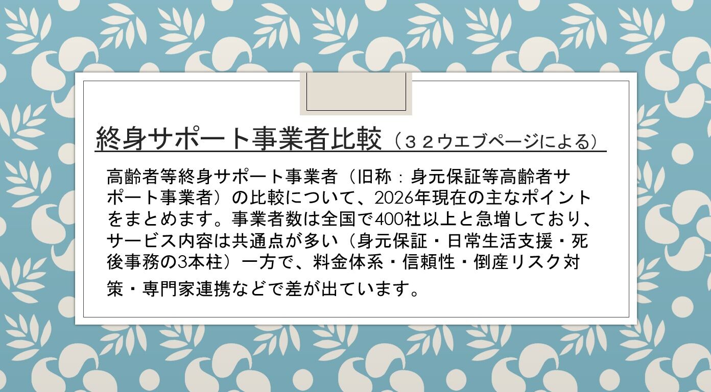 高齢者等終身サポート事業者(旧称:身元保証等高齢者サポート事業者)の比較について、2026年現在の主なポイントをまとめます。