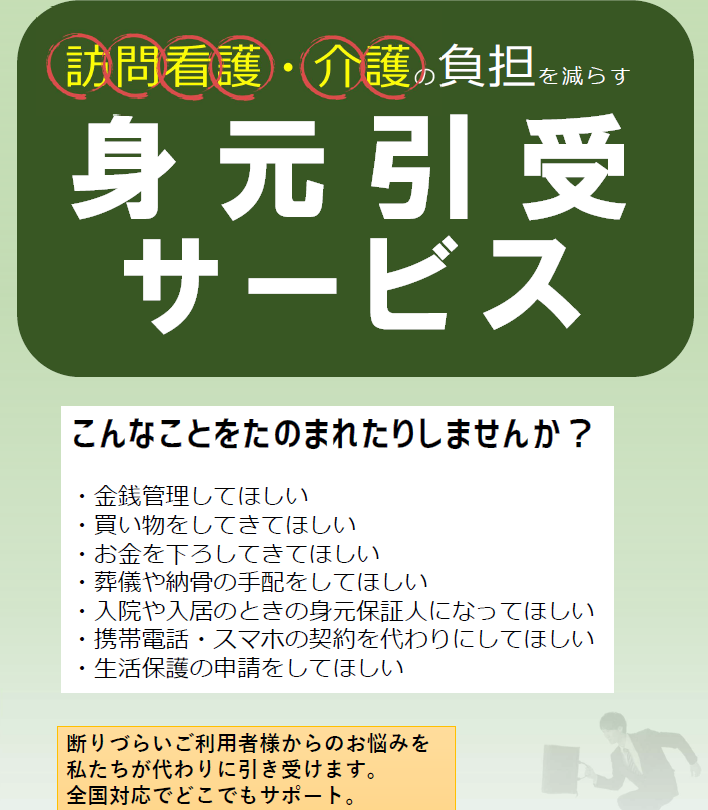 そのような日常の業務に付随する業務が増えてきたとお考えの方が多くなっているのではないでしょうか。世の中が無縁社会となり、従来は家族が行ってきたこれらの業務を日常訪問している介護、看護従事者が頼まれる機会がふえてきていることは、総務省の身元引受サービス調査でも指摘されています。